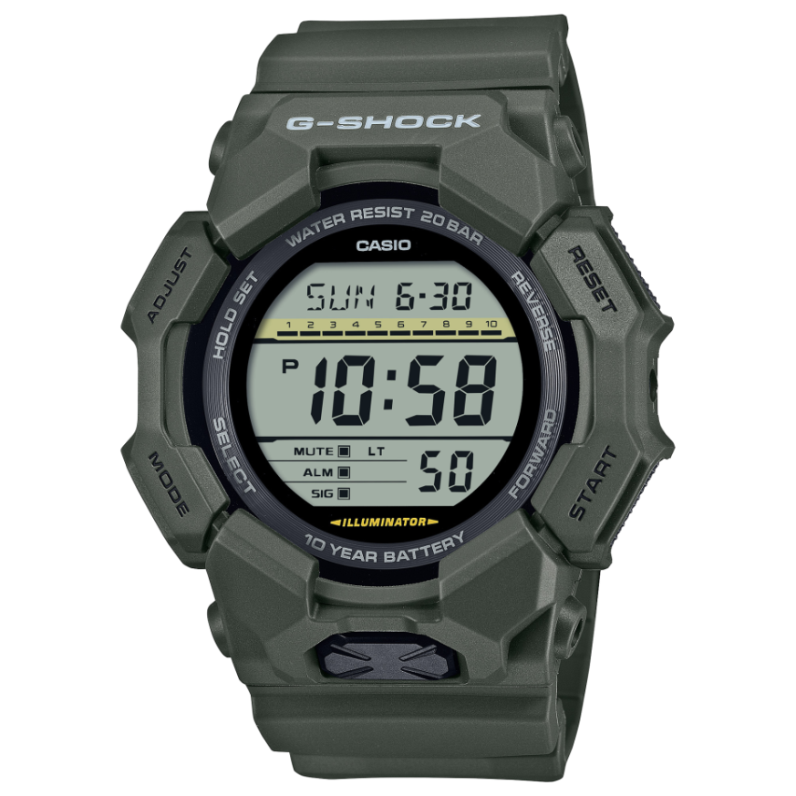 CASIO GD-010-3ER е впечатляващ G-SHOCK часовник в атрактивен маслено-зелен цвят, съчетаващ здравина, функционалност и стил. SHOCK конструкцията го прави изключително устойчив на удари и вибрации, а Super LED подсветката гарантира видимост във всякакви условия. Благодарение на 10-годишната батерия, този модел предлага дългосрочна надеждност без нужда от поддръжка. Разполага със световно време, 5 независими аларми, хронометър с прецизност 1/1000 секунда и таймер за обратно броене. Корпусът и каишката са от високоустойчив полимер, а водоустойчивостта до 200 м позволява ползване дори при гмуркане.