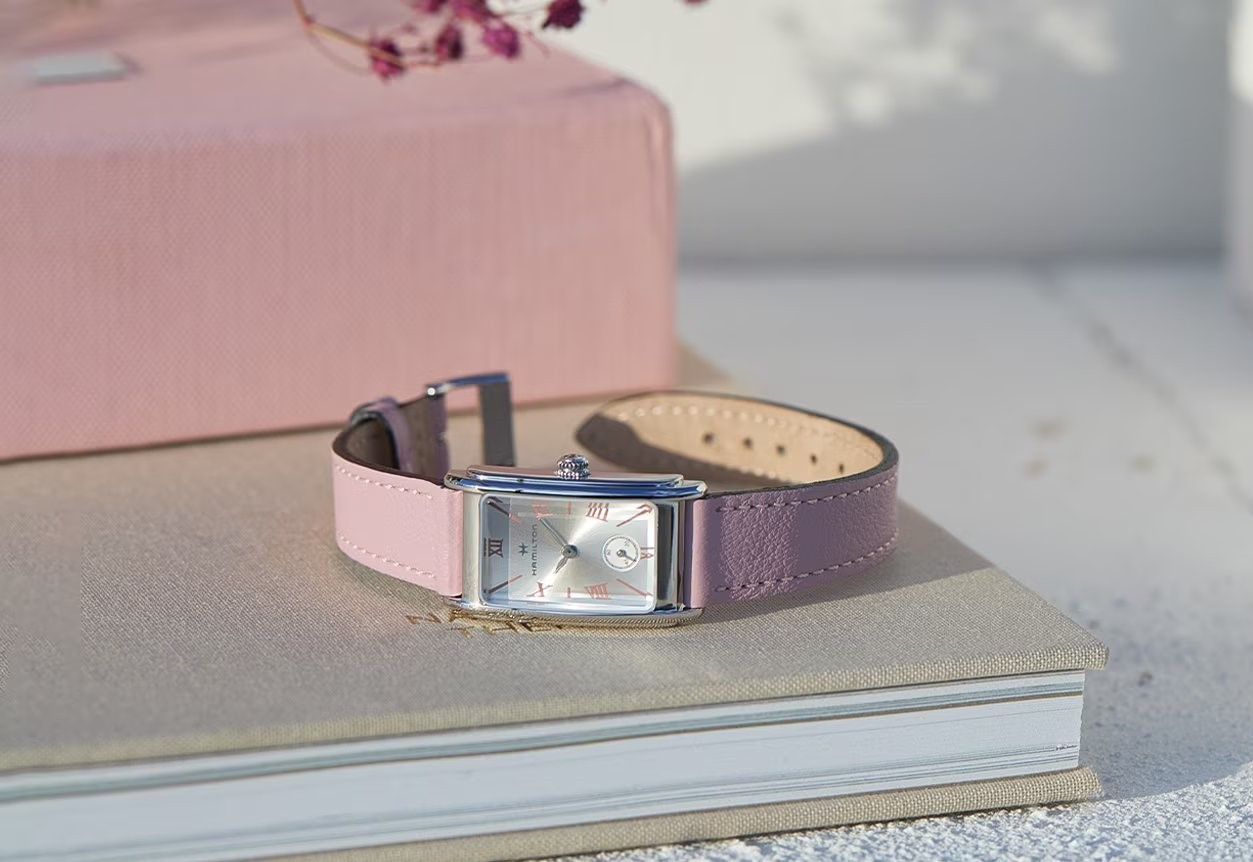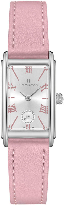 Hamilton H11221853 – Ardmore Small Quartz Lady е часовник, вдъхновен от безвремието на Art Deco епохата и преработен в свежо, женствено излъчване. Това е аксесоар, който казва много с малко – благодарение на компактния си правоъгълен корпус, розова кожена каишка и изчистен, сребрист циферблат.
