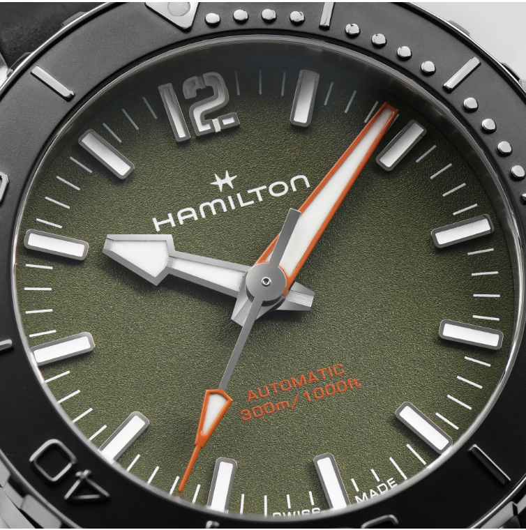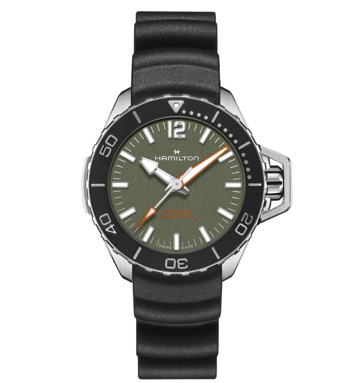 Часовник HAMILTON Khaki Navy Frogman Auto H77455360 е създаден за сериозни подводни приключения. С корпус от благородна стомана, въртящ се керамичен безел и устойчивост до 300 метра дълбочина, този модел е истински партньор за гмуркачи и авантюристи. Автоматичният механизъм H-10 осигурява 80 часа енергиен запас, докато луминисцентните стрелки и индекси гарантират отлична видимост под вода. Каки циферблатът добавя характер и стил, правейки модела подходящ и за ежедневието.
