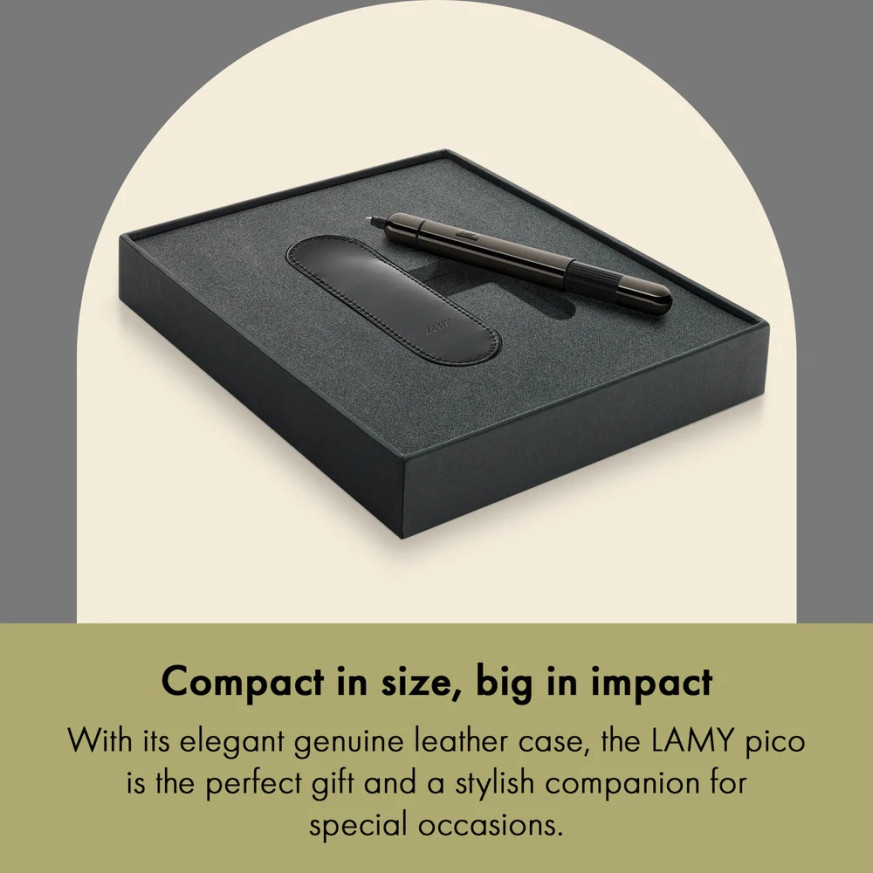 Красива и малка, когато се намира на вашето бюро, Lamy Pico Lx се трансформира изцяло, когато я натиснете: чрез иновативния механизъм заложен в нея Pico претърпява метаморфозата от изискан джобен формат до напълно готова за писане химикалка, а когато бъде натисната повторно се връща обратно в компактния си и удобен за пренос размер.