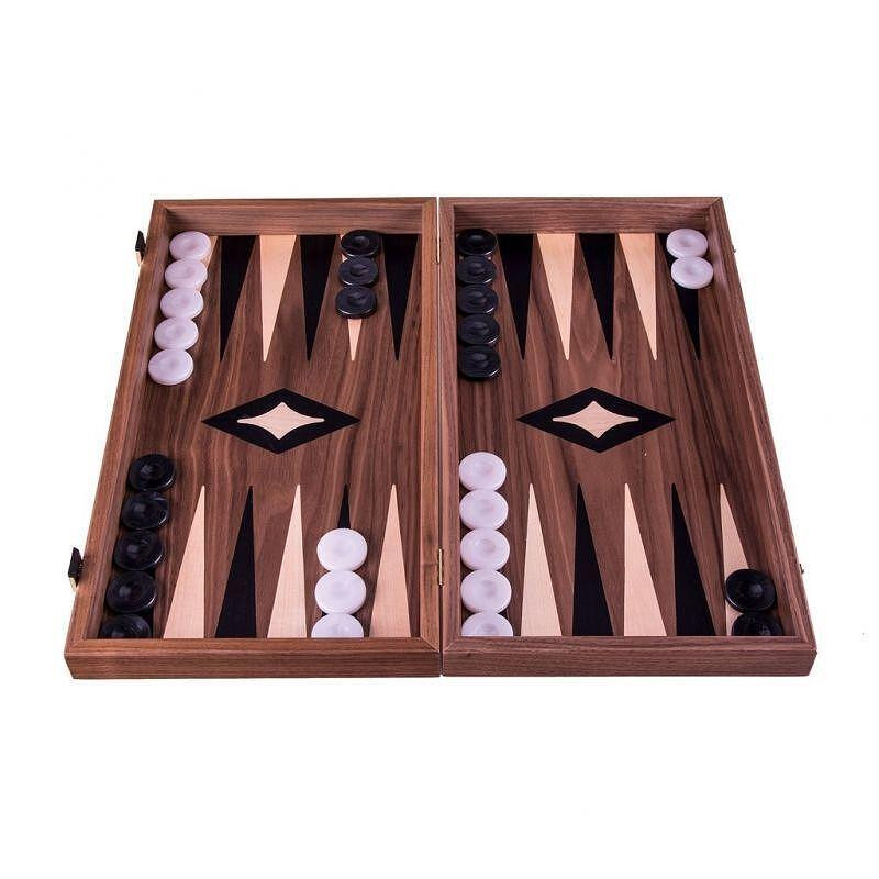 Този комбиниран комплект 2 в 1 в орехово дърво е перфектен подарък, защото включва шах и табла в една луксозна комбинация! Включени са дървени шахматни фигури и пулове. Таблата е ръчно изработена. Игралното поле е комбинация от орех с дъбови и черни цветни капии. Ореховият фурнир e уникален и всяка табла е съвсем различна от останалите. Тази табла е ръчно изработена с помощта на изкуството на маркетри (изписва се също като marqueterie), което е изкуството и занаятът за прилагане на парчета фурнир върху конструкция за да се оформят декоративни шарки и дизайни. Опитните майстори от Manopoulos използват този метод за да създадат вътрешния дизайн на таблата.