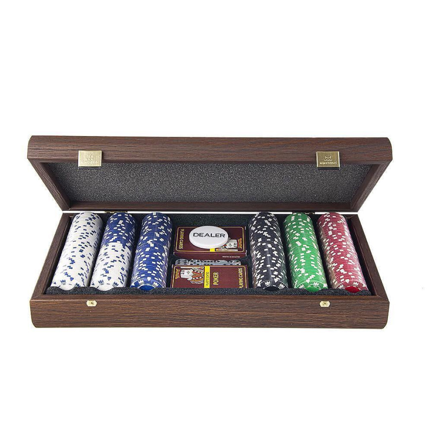 Покер комплект в дървена кутия реплика на тъмен орех. Този луксозен покер комплект е ръчно изработен от дърво с кадифен трей отвътре. Включва 300x висококачествени покер чипа по 11,5 гр и 2x комплекта карти за игра -  най-добрият подарък за сериозния играч! Семпъл, но елегантен; този комплект е всичко, от което се нуждаете за една забавна вечер с приятели. Съдържание и характеристика: