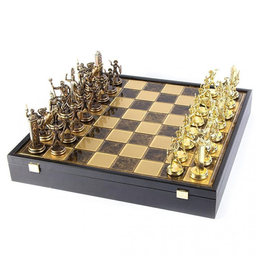 Гръцките скулптори обичали да пресъздават конфликта на боговете от древните легенди чрез своето изкуство. Царят в този шах е реплика на известната статуя „Посейдон от Мелос” (II в. Пр.н.е.), а царицата представлява славната „Атина Промахос” (450 г. пр. Хр., Музей на Акропола). Бронзова елинистична статуя е вдъхновила офицера, а конят е част от мраморната фасада на Партенона, изваяна от Федий. Топът е репродукция на една от най-възхитителните атически стели, посветена на загиналия в битка млад Арис. Пешката е бронзова статуя на напълно въоръжен воин от 500 г. пр.н.е.