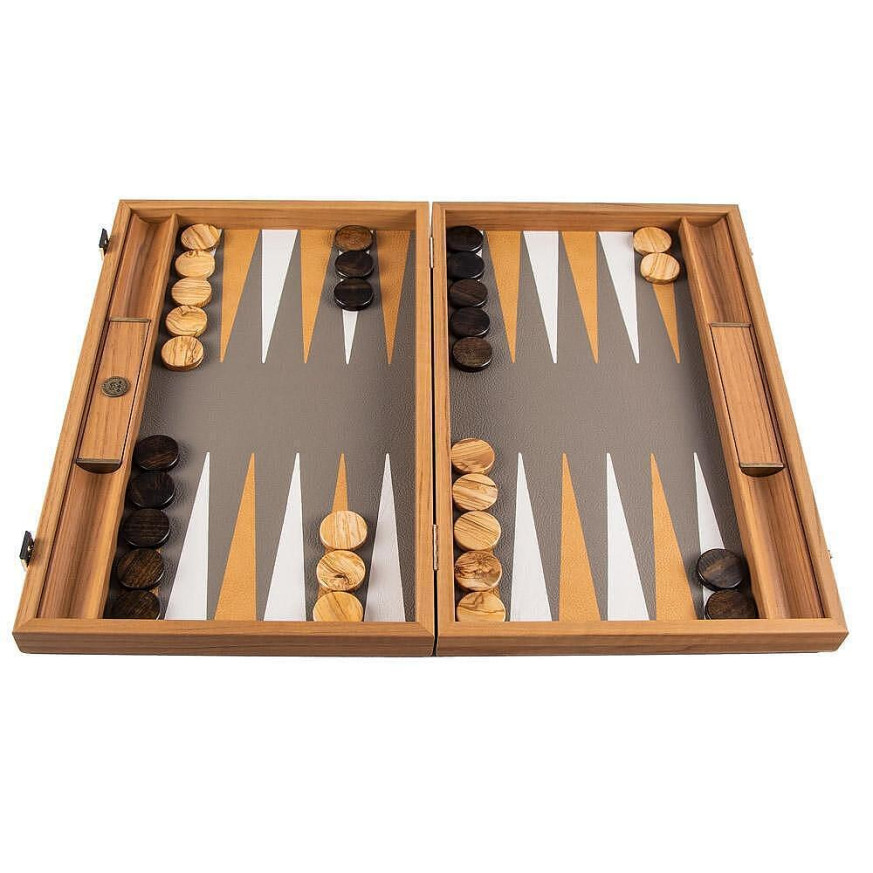 Класическа табла с принт от еко кожа 30x пула от маслиново дърво 4x зара 1 кубче за удвояване Комплект дървени чаши за зарове Опаковка: подаръчна кутия Manopoulos Размер в затворено състояние - 48 х 30см Размер в отворено състояние - 48 х 60см Тегло на комплекта 2,8 кг Игрално поле: Еко кожа с първокласно качество Външно покритие: Имитация на щраусова кожа Рамка: Ламинирано дърво