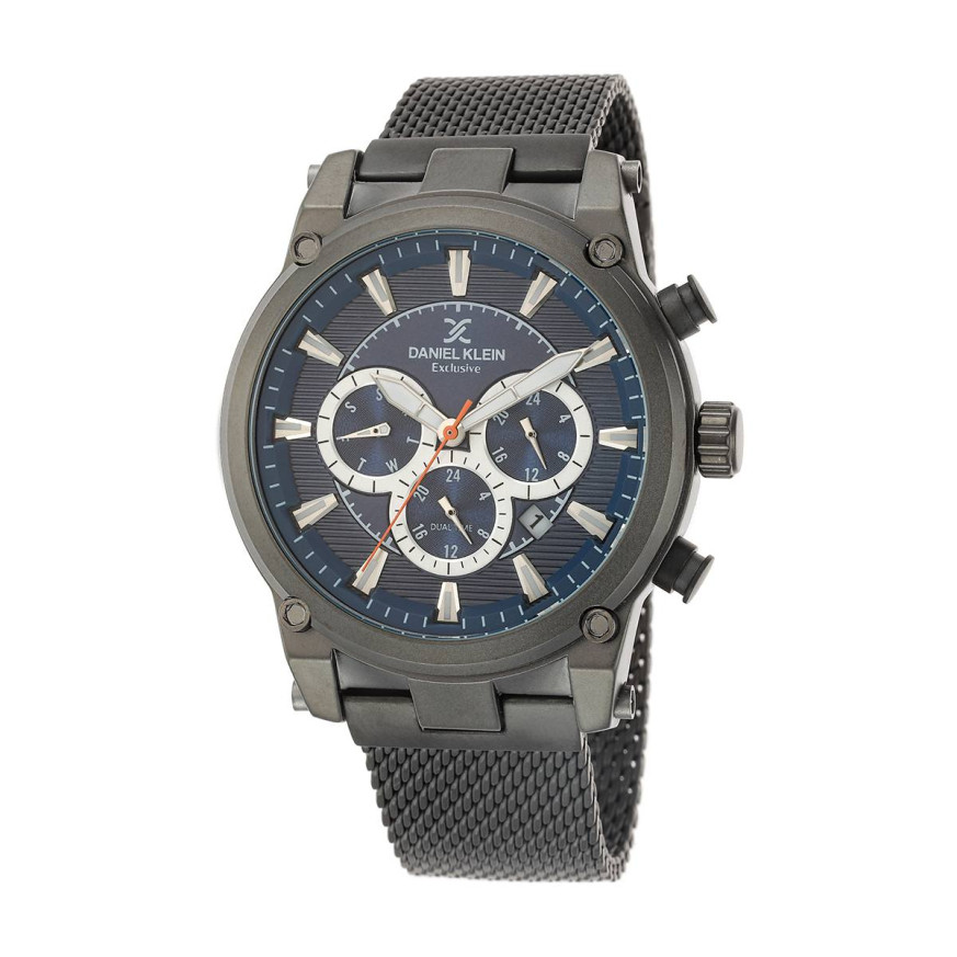 Спортно-елегантен мъжки часовник Daniel Klein от колекцията Exclusive. Мултифункционален дисплей с показатели за дата, ден и двойно време. Стъкло минерал-кристал. Корпус от висококачествена метална сплав. Верижка от неръждаема стомана тип “mesh”. Задвижва се от кварцов механизъм. Водоустойчивост 5 ATM - допускат се леки пръски и взимане на душ, не се препоръчва обилно мокрене.