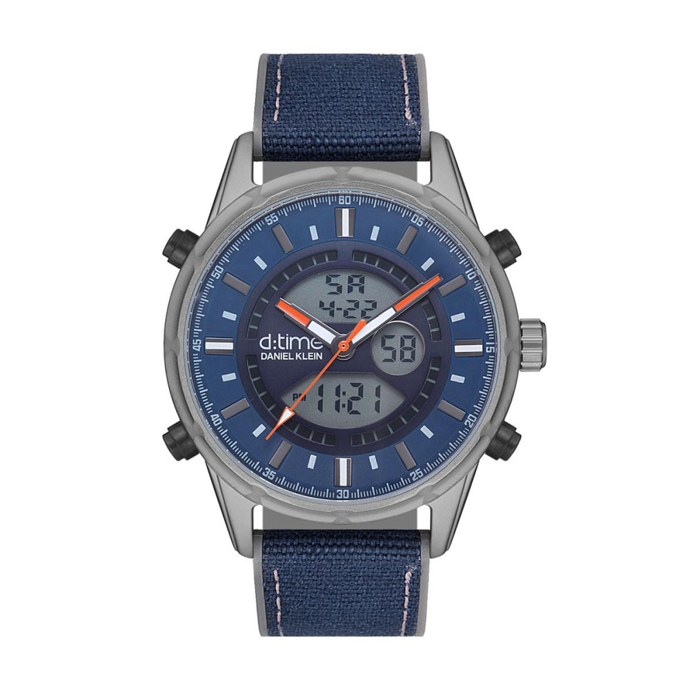 Мъжки часовник Daniel Klein със спортно-ежедневен дизайн от колекцията D Time. Аналогов дисплей с дигитални поддисплеи. Стъкло минерал-кристал. Корпус изработен от висококачествена метална сплав. Каишка комбинация от текстил и силикон. Задвижва се от кварцов механизъм. Водоустойчивост на часовника 3 ATM - допускат се леки пръски, не се препоръчва обилно мокрене.