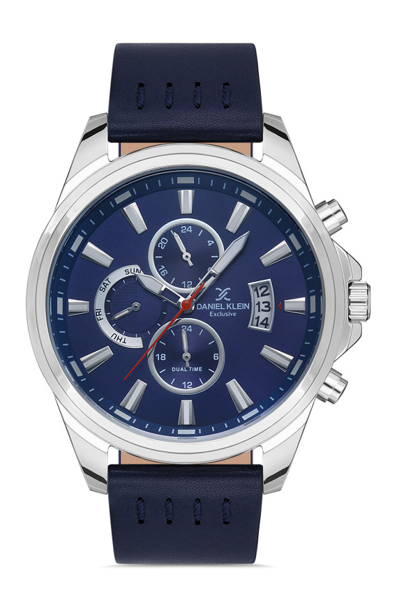 Елегантен мъжки часовник Daniel Klein от колекцията Exclusive. Метален корпус  в комбинация с каишка от естествена кожа. Стилен мултифункционален дисплей  с луминисцентно покритие на стрелките и индексите. Минерално стъкло, устойчиво на надраскване. Задвижва се от кварцов механизъм. Водоустойчивост 5 ATM - допускат се леки пръски и взимане на душ, не се препоръчва обилно мокрене.