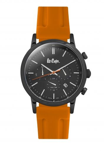 Мъжки часовник Lee Cooper от колекцията Classic Dual Time. Корпус от супер метал и стъкло минерал-кристал. Оранжева силиконова каишка. Черен мултифункционален дисплей с бели стрелки и акценти и показатели за дата, ден и двойно време. Задвижва се от кварцов механизъм. Водоустойчивост 3 ATM - допускат се леки пръски, не се препоръчва обилно мокрене.
