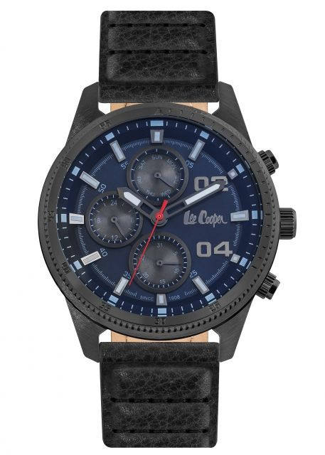 Мъжки часовник Lee Cooper с мултифункционален дисплей. Моделът е с корпус изработен от супер метал. Черна каишка от естествена кожа. Стъкло минерал-кристал. Кварцов механизъм. Водоустойчивост 5 ATM - допускат се леки пръски и взимане на душ, не се препоръчва обилно мокрене.