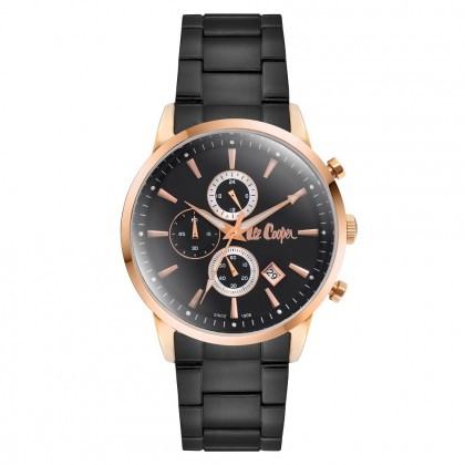 Спортно-елегантен мъжки часовник Lee Cooper с черен дисплей хронограф от колекцията Classic Multifunction. Моделът е с корпус и верижка изработени от супер метал. Стъкло минерал-кристал. Задвижва се от кварцов механизъм. Водоустойчивост 3 ATM - допускат се леки пръски, не се препоръчва обилно мокрене.