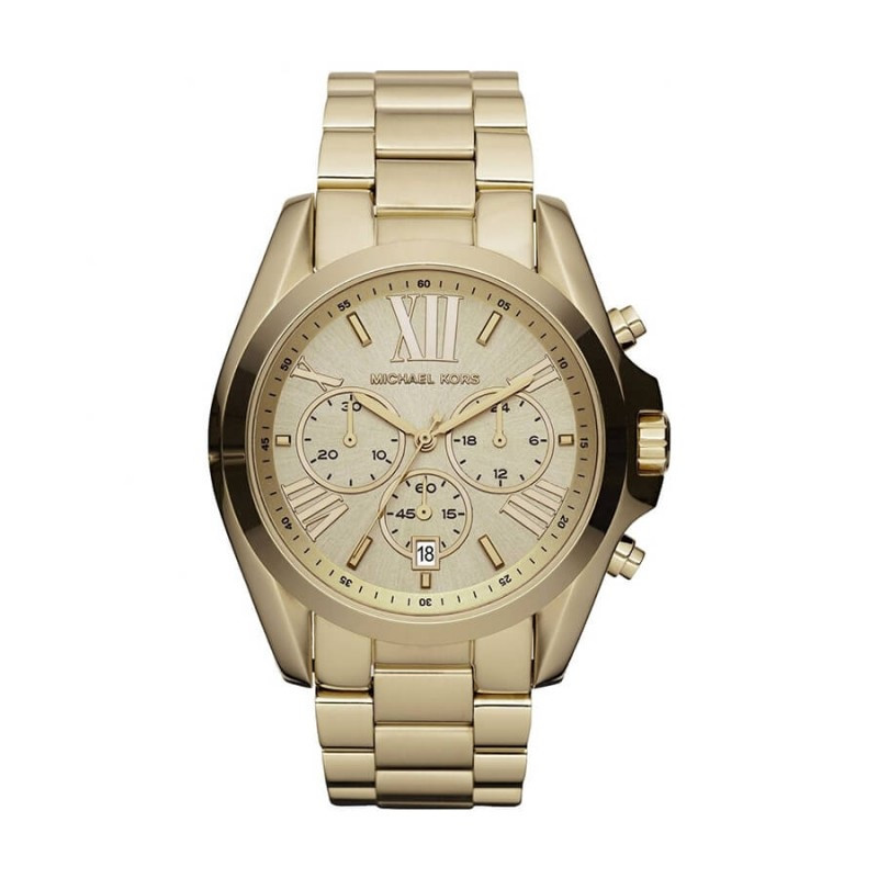 Michael Kors MK5605 от колекцията Bradshaw е силен стилов акцент с изцяло златисто покритие и хронографски функции. Корпусът и верижката са от благородна стомана с жълто PVD позлатяване, а златистият циферблат придава завършен луксозен вид.