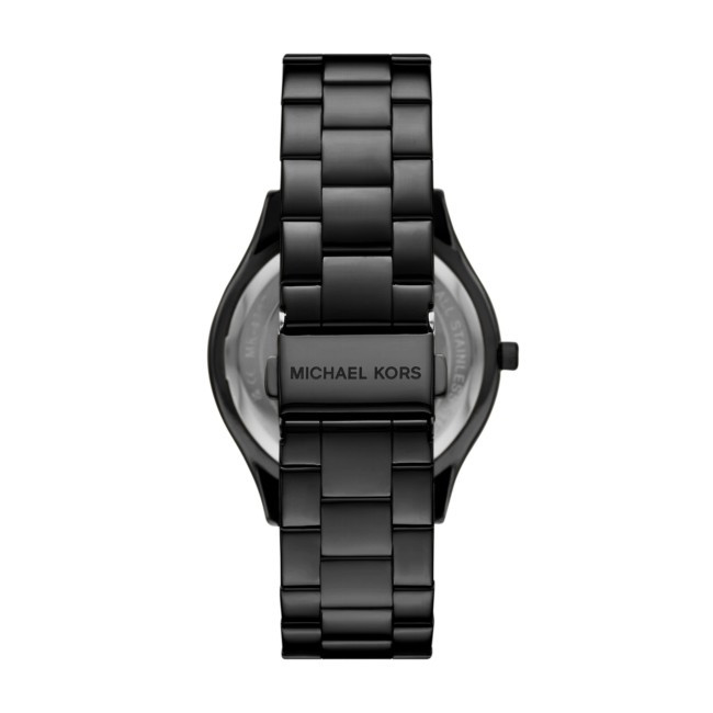 Дамски Часовник Michael Kors MK4734   Michael Kors MK4734 от колекция Slim Runway e дамски кварцов часовник с черен кръгъл циферблат, черен корпус от неръждаема стомана с диаметър 42 mm и черна верижка 30 mm, изработена от неръждаема стомана.