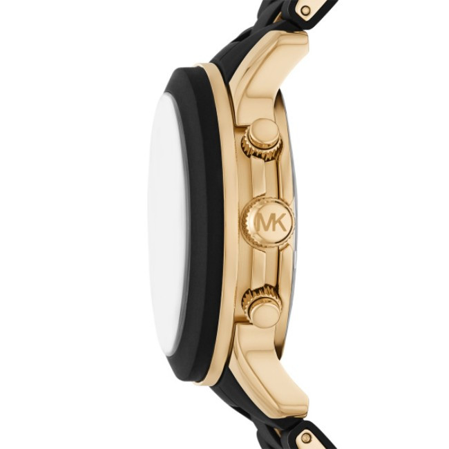 Michael Kors MK7385 от колекция Runway e дамски кварцов часовник с черен кръгъл циферблат, златист корпус от неръждаема стомана с широчина 38 mm и многоцветна верижка 20 mm, изработена от микс материали.