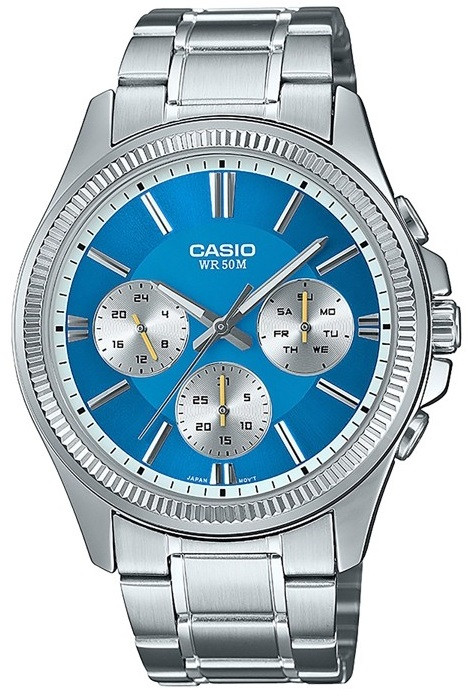 CASIO MTP-1375PD-2A2VEF е стилен мъжки часовник с изчистен дизайн, подходящ за бизнес и ежедневна визия. Моделът се отличава със син циферблат с три подциферблата – за дата, ден от седмицата и 24-часов формат, което го прави не само елегантен, но и функционален. Корпусът и верижката са изработени от благородна стомана, а минерал-кристалното стъкло е устойчиво на надраскване. С диаметър 43,8 мм и водоустойчивост до 5 ATM, този часовник предлага издръжливост, комфорт и класа в едно.