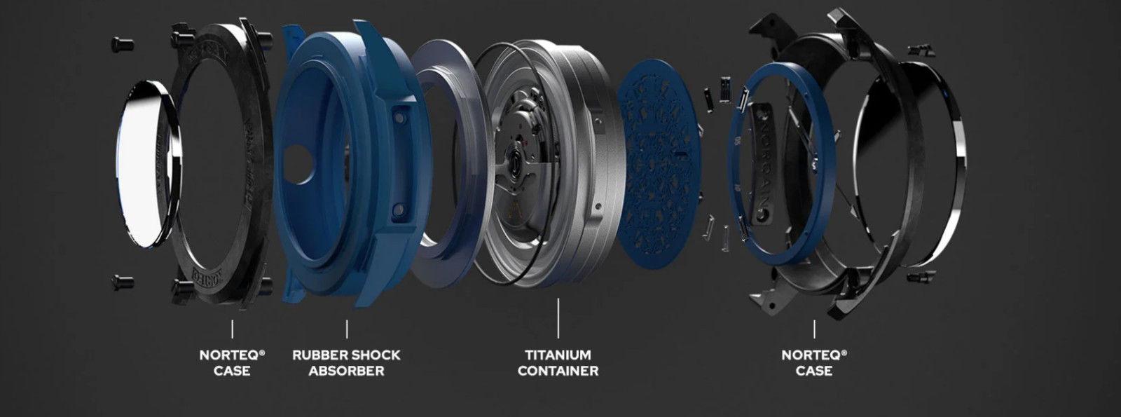 Между тях е поставен каучуков амортисьор, който обгръща титаниев контейнер с механизъм NN20/1 Manufacture Calibre.