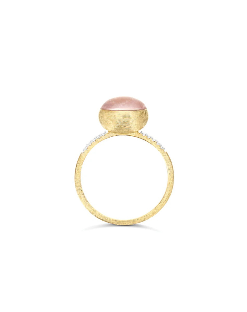 Вдъхновен от популярната италианска напитка "Rosolio", този романтичен пръстен от колекцията Boules пленява не само със своята елегантност и изтънченост, но и с отличителния си завършек. В това бижу 18-каратовото злато се среща и слива с триплет планински кристал, ягодов кварц и седеф, пренаписвайки емблематичния Nanis boule с живи цветове.