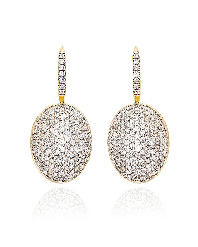 Златни обеци от 18 Кt, увенчани с елегантни диамантени детайли. Изисканата златна изработка играе със светлината, отразява я огледално и запечатва срещата между Природата и майсторството.
