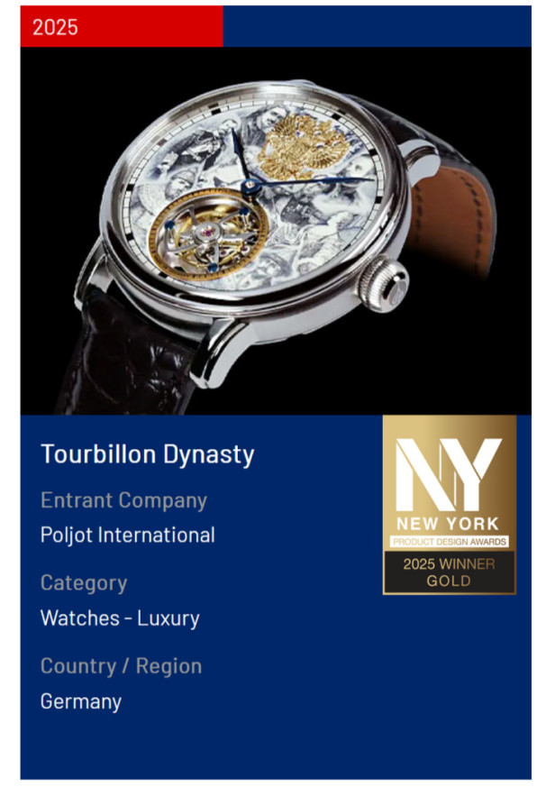 Poljot International с голяма награда за дизайн – Tourbillon Dynasty е „Gold Winner 2025“!