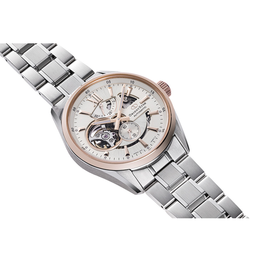 Мъжки часовник Orient Star с модерен спортно-елегантен дизайн. Моделът е с корпус и верижка от неръждаема стомана.Дисплеят е аналогов  с отвор, позволяващ да се наблюдава част от механизма, индикатор за резервната мощност и отделен секундарник. Стъклото е сапфир-кристал с антирефлексно покритие. Задвижва се от автоматичен механизъм Cal. F6F44. Водоустойчивост 10 ATM - позволява мокрене, къпане и плуване във водни басейни.