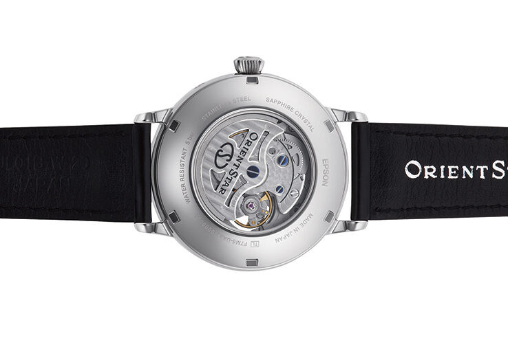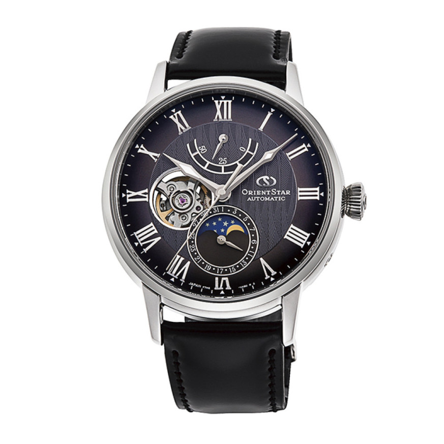 Мъжки часовник Orient Star от колекцията M-Collection /M45 F7/ Mechanical Moon Phase. Корпусът е от неръждаема стомана и е съчетан с черна каишка от естествена кожа. Моделът е с интересен мотив, наподобяващ течаща вода върху циферблата. Цветовата градация придава на циферблата привлекателен контраст и усещане за дълбочина. Часовникът е с отвор, позволяващ да се наблюдава част от механизма, индикатор за резервната мощност, индикатор за лунна фаза и дата. Сапфирено стъкло с антрирефлексно покритие. Автоматичен японски механизъм F7M62 с резервна мощност 50 часа и 22 камъка. Водоустойчивост 5 ATM - допускат се леки пръски и взимане на душ, не се препоръчва обилно мокрене.