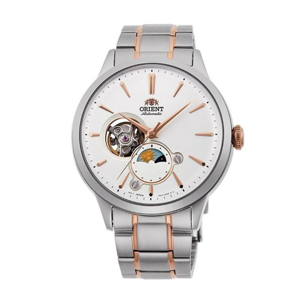 Моделът ORIENT RA-AS0101S от колекцията Classic Automatic Open Heart предлага хармонично съчетание между класика и механична естетика. Функцията "Слънце и Луна" визуализира преминаването между ден и нощ на 24-часов диск, докато отворената част на циферблата разкрива част от автоматичния механизъм. Корпусът е от благородна стомана, допълнен с верижка с розови акценти и куполовидно стъкло с "sunburst" завършек.