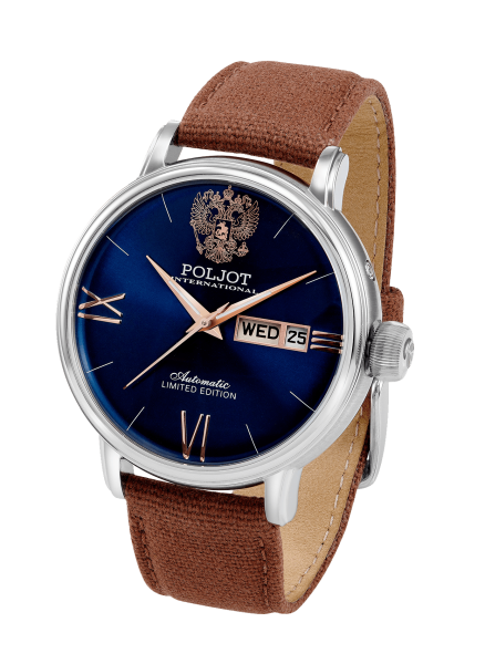 Часовник POLJOT INTERNATIONAL TSARS OF RUSSIA 2427.1541512 е лимитиран мъжки модел с автоматичен механизъм и класически дизайн, вдъхновен от руската империя. Син циферблат с позлатени стрелки и символичен двоен орел подчертават връзката с царската традиция. Прецизно изработен корпус от благородна стомана, водоустойчивост 50 м и каишка от естествена кожа с текстил. Произведен в лимитирана серия от 300 броя – перфектна инвестиция в стил и история от ClassicWatches.bg.