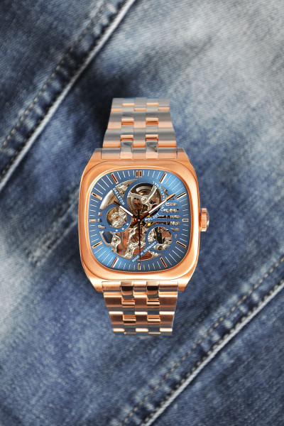 Скелетизираните циферблати и механизми очароват от пръв поглед. Като един сглобен механизъм, те се вписват перфектно един в друг. И цветът влиза в играта. Петролносиният цвят перфектно се съчетава с розово-златистата метална верижка, разработена специално за тази линия. Тя е класическа по дизайн, но също така много изискано качество. Допълнителни детайли, като стрелките, апликациите на часовете и кожените каишки, допълват дизайна. Автоматичният механизъм е скелетизиран и фино декориран.