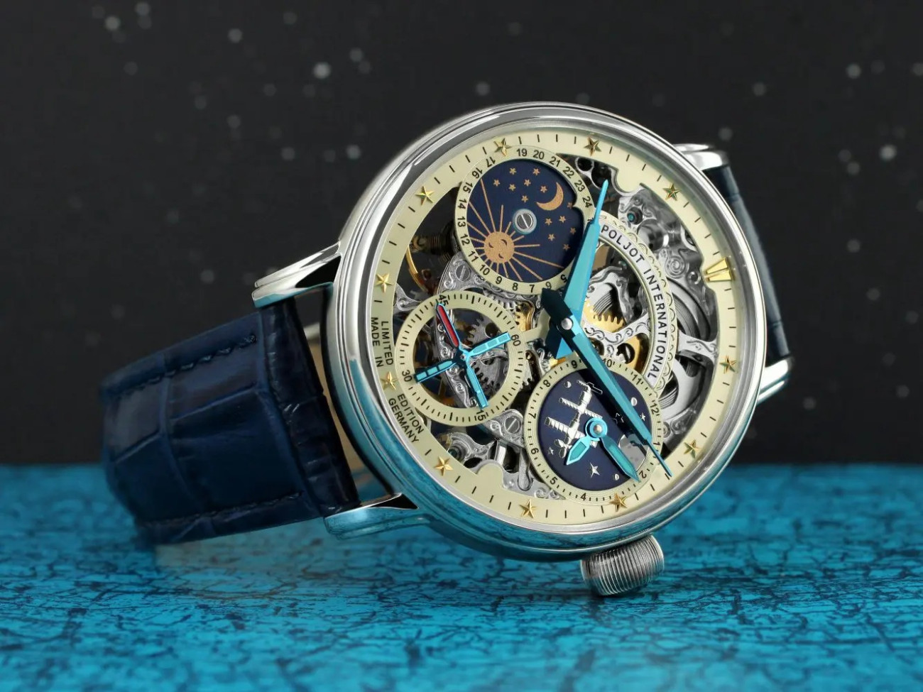 Часовник POLJOT INTERNATIONAL ORBITA 9931.2940566 е лимитиран мъжки модел, вдъхновен от Международната космическа станция. Скелетон циферблат с индикатор за ден и нощ, втора часова зона и синьо светещи стрелки го правят изключителен по дизайн и функция. С ръчно навиван механизъм, резерв от 36 часа и телешка каишка с крокодилска шарка, моделът е произведен в едва 400 броя. Предлага се в ClassicWatches.bg.