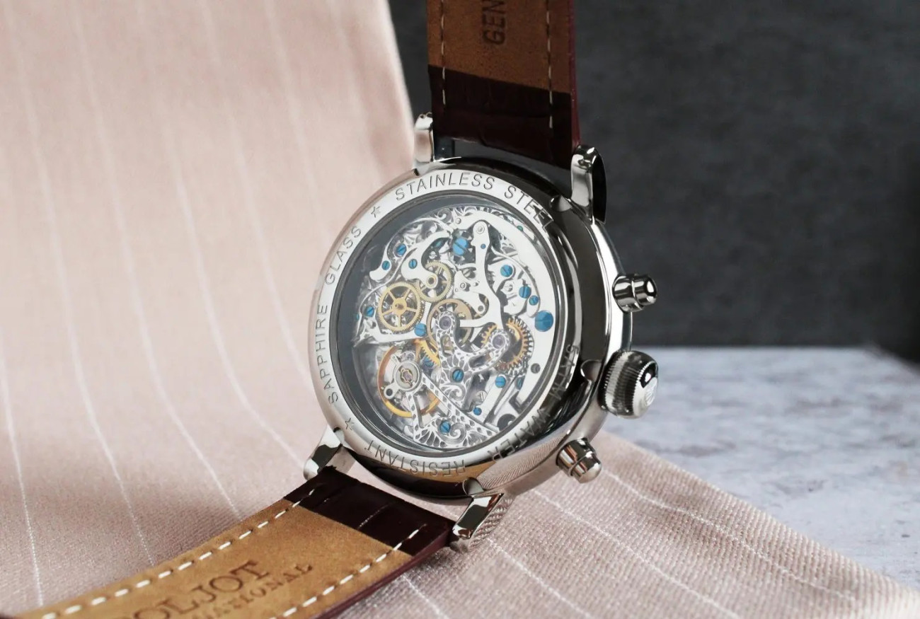 Корпусът се отличава с фино полирано покритие отстрани, докато безелът и задният капак са полирани. Това създава привлекателен контраст и хармонично взаимодействие на противоположностите. Предната част е снабдена с извито сапфирено стъкло, а задната част е с прозрачен капак, от който се вижда ръчно навиващият се скелетонизиран хронографски механизъм със сложни гравюри. Набраздената коронка осигурява лесно и удобно навиване на часовника.