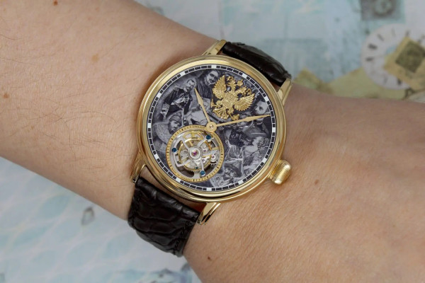 Името на този турбийон е „Династия“ и това не е случайно, циферблатът обединява цяла историческа руска епоха– цяла династия.