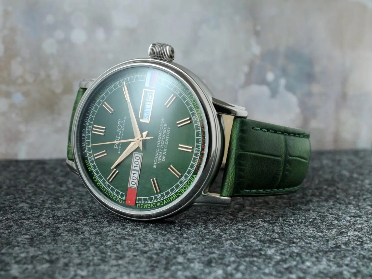 Часовник Poljot International Gorbatschow 36NH.4200115 е лимитиран модел, посветен на световната личност Михаил Горбачов. Автоматичният механизъм NH36 осигурява прецизност, надеждност и 41 часа енергиен резерв. Със своя елегантен зелен циферблат, позлатени индекси и сапфир кристал, този модел е символ на мир, преход и историческа стойност. Ограничен до 100 броя – колекционерска рядкост със силно послание.