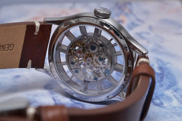 Механичният механизъм на SeaGull калибър TY6DSK е скелетонизиран с възможно най-големите отвори и монтиран в касата. Мостовете на движението са гравирани, а винтовете посинени.