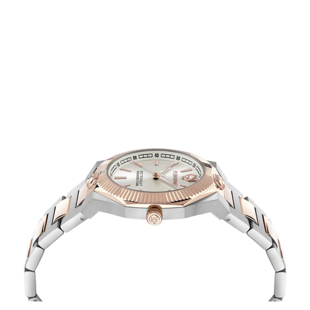 Часовник Philipp Plein PSDGA0425 – елегантен дамски модел от колекцията Plein Sport Metronaut, който комбинира спортен дух и изтънчен лукс. Сребристият аналогов циферблат с мотив глава на тигър и детайли в розово злато придава уникален характер и стил. Корпусът и верижката от неръждаема стомана осигуряват издръжливост и комфорт, а минерал-кристалното стъкло предпазва от надрасквания. Водоустойчивостта до 5 ATM и кварцовият механизъм гарантират надеждност при ежедневно носене.