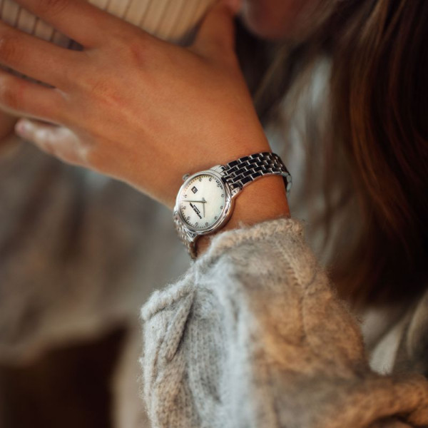 Циферблат Перла /  Дата на три часа / Сребристи стрелки / 11 Диаманта -   0.04 ct., single cut 8/8 - SI2 to SI1