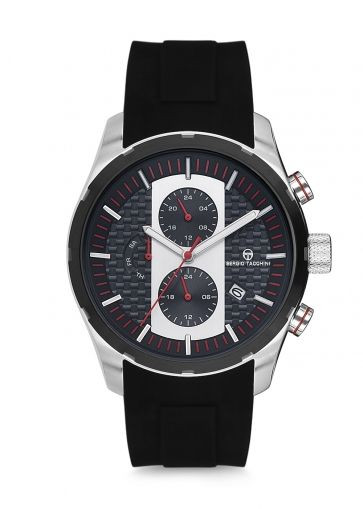 Мъжки часовник Sergio Tacchini от колекцията Archivio Dual Time. Моделът е с черен мултифункционален дисплей с червени детайли. Корпус от неръждаема стомана, съчетан със силиконова каишка. Стъкло минерал-кристал. Задвижва се от кварцов механизъм. Водоустойчивост 10 ATM - позволява мокрене, къпане и плуване във водни басейни.