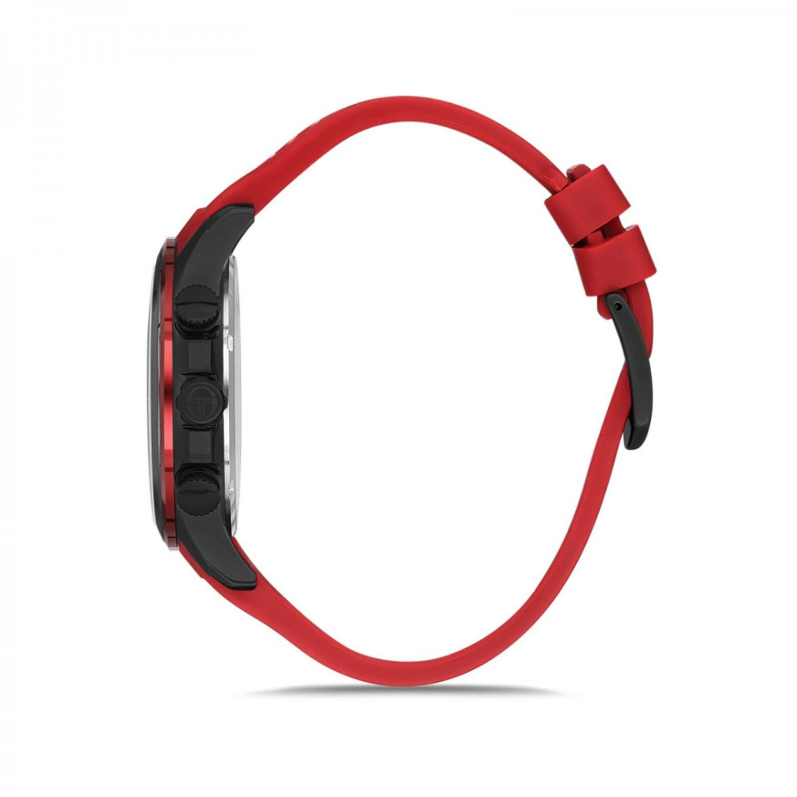 Мъжки часовник Sergio Tacchini със спортен дизайн от колекцията Archivio. Корпус от неръждаема стомана. Червена силиконова каишка. Мултифункционален дисплей със сребристи фосфоресциращи стрелки и индекси. Минерално стъкло, устойчиво на надраскване. Задвижва се от кварцов механизъм. Водоустойчивост 5 ATM - допускат се леки пръски и взимане на душ, не се препоръчва обилно мокрене.