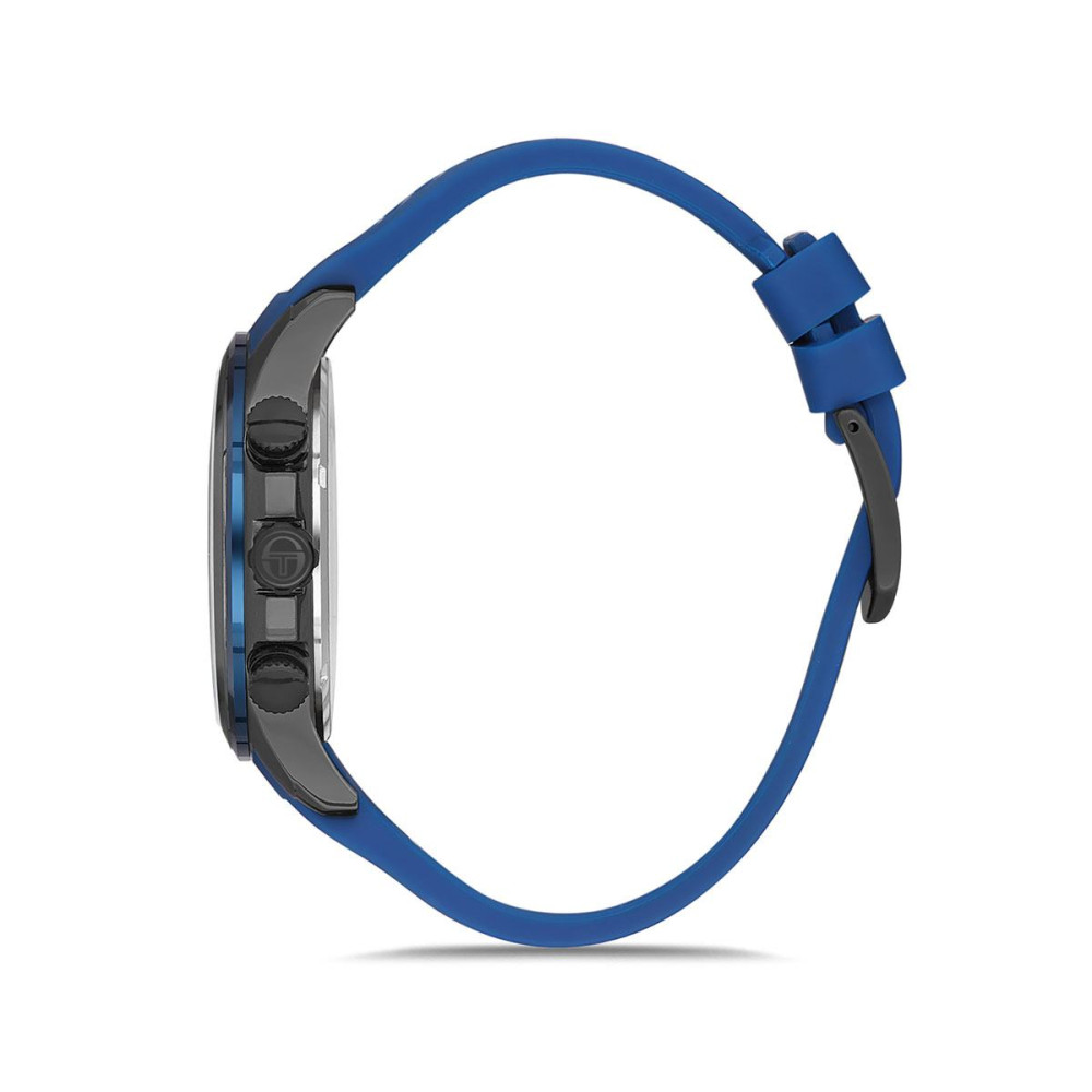 Мъжки часовник Sergio Tacchini със спортен дизайн от колекцията Archivio. Корпус от неръждаема стомана. Синя силиконова каишка. Мултифункционален дисплей със сребристи фосфоресциращи стрелки и индекси. Минерално стъкло, устойчиво на надраскване. Задвижва се от кварцов механизъм. Водоустойчивост 5 ATM - допускат се леки пръски и взимане на душ, не се препоръчва обилно мокрене.