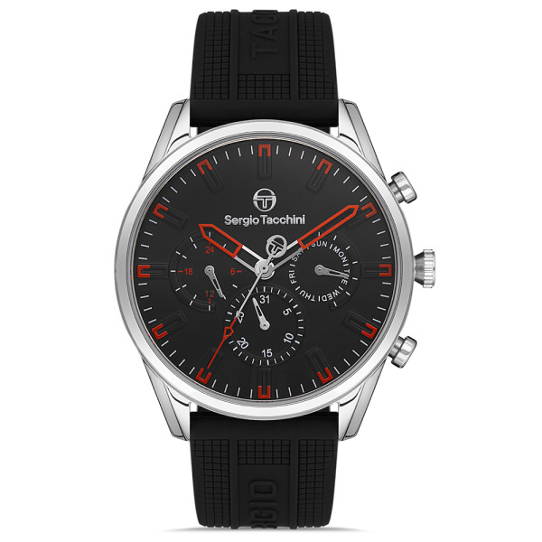 Мъжки часовник Sergio Tacchini от колекцията Archivio със спортно-елегантна визия. Моделът е с корпус от неръждаема стомана и черна силиконова каишка. Мултифункционален дисплей с минерално стъкло. Кварцов механизъм. Водоустойчивост 5 ATM - допускат се леки пръски и взимане на душ, не се препоръчва обилно мокрене.