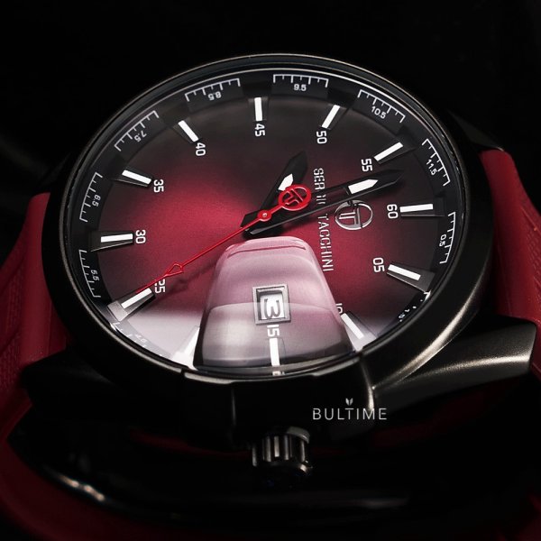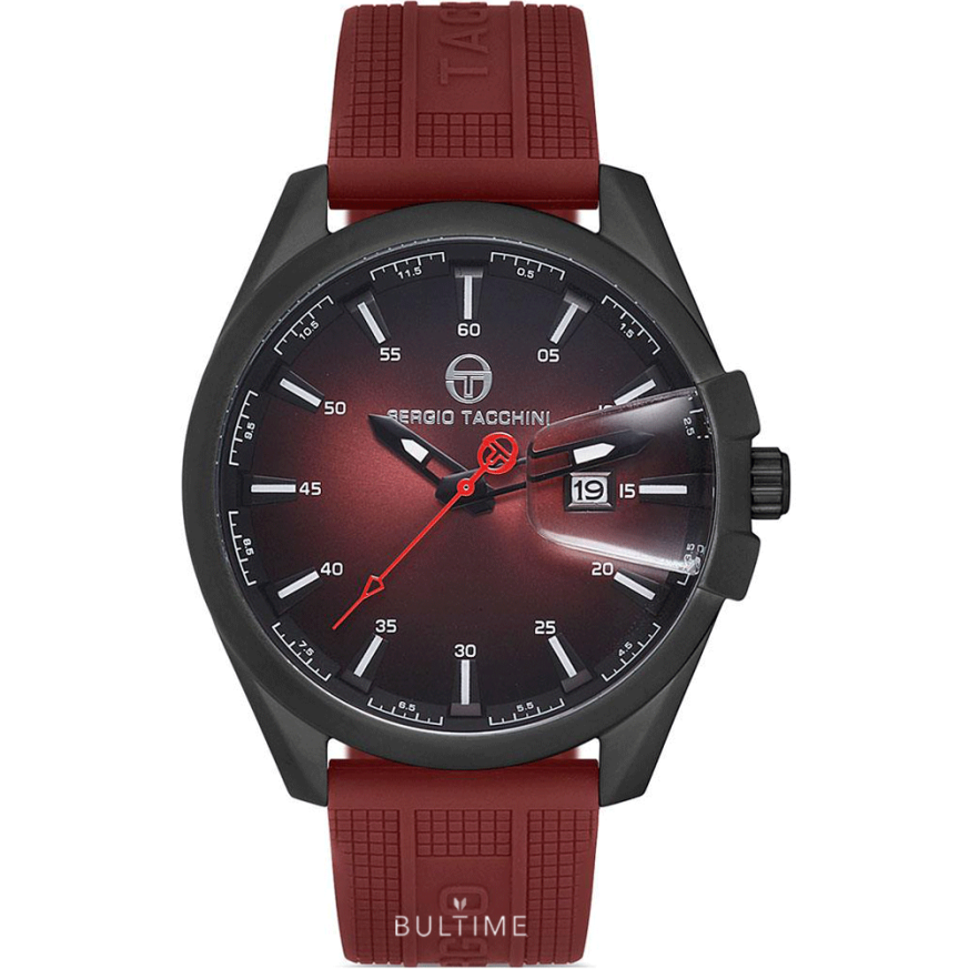 Мъжки часовник Sergio Tacchini със спортно-ежедневен дизайн от колекцията Archivio. Аналогов дисплей в преливащи се цветове и показател за дата. Стъкло минерал-кристал. Корпус от месинг. Тъмночервена силиконова каишка. Кварцов механизъм. Водоустойчивост 5 ATM - допускат се леки пръски и взимане на душ, не се препоръчва обилно мокрене.