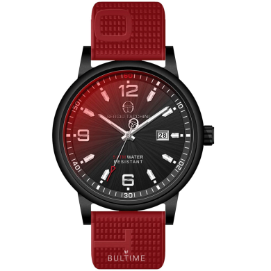 Мъжки часовник Sergio Tacchini с модерна спортно-елегантна визия от колекцията Streamline. Моделът е с корпус от алуминий, съчетан с червена силиконова каишка. Аналогов дисплей в преливащи се цветове и показател за дата. Минерално стъкло, устойчиво на надраскване. Задвижва се от кварцов механизъм. Водоустойчивост 5 ATM - допускат се леки пръски и взимане на душ, не се препоръчва обилно мокрене.