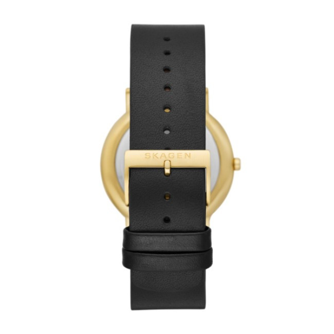 Skagen SKW6897 от колекция Signatur e мъжки кварцов часовник с черен кръгъл циферблат, златист корпус от неръждаема стомана с широчина 40 mm и черна каишка 20 mm, изработена от естествена кожа.