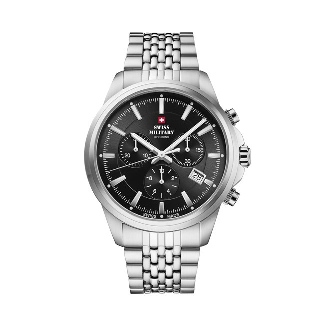 Часовник SWISS MILITARY by CHRONO SM34107.01 е стилен мъжки швейцарски хронограф с черен циферблат и спортно-елегантен характер. Моделът е оборудван с прецизен механизъм Ronda 5040.D, осигуряващ надеждно измерване на времето. Корпусът и верижката са изработени от благородна стомана, а сапфир кристалът предпазва от надрасквания. С водоустойчивост до 10 ATM, този часовник комбинира функционалност, здравина и изтънчен швейцарски дизайн – идеален за всеки ден.