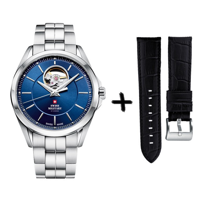 Часовник SWISS MILITARY by CHRONO SMA34085.23SET е швейцарски автоматичен open heart модел с впечатляващ син циферблат и елегантен стил. Сетът включва часовник от благородна стомана със сребриста верижка и допълнителна черна кожена каишка. Сапфир кристалът гарантира защита от надраскване, а механизмът Sellita SW200 Open Heart осигурява надеждна прецизност. Водоустойчивостта до 10 ATM и изисканият дизайн го правят перфектен избор за всеки повод.