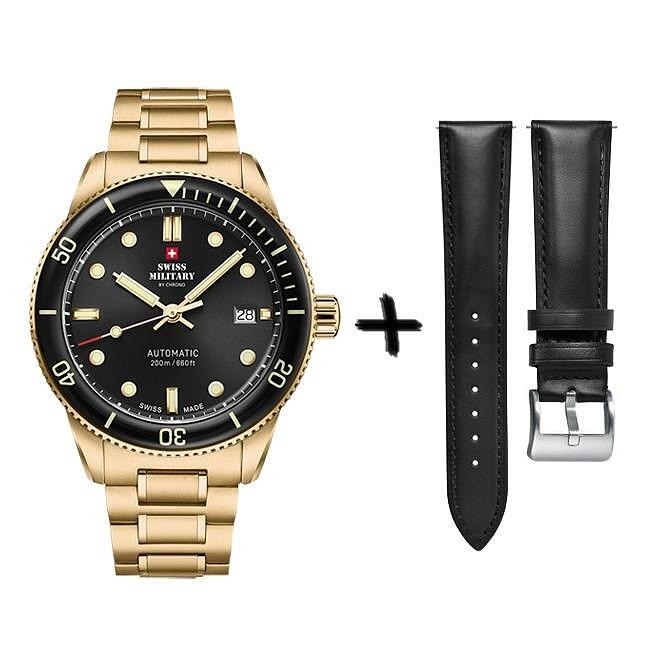 Часовник Swiss Military By Chrono SMA34106.04SET е изискан мъжки швейцарски автоматичен модел, представен в луксозен сет с допълнителна черна кожена каишка. Моделът от колекцията SMA34106 съчетава златист корпус и верижка от благородна стомана с елегантен черен циферблат, защитен от сапфир кристал. Сърцето на часовника е надеждният автоматичен механизъм Sellita SW200. С водоустойчивост до 20 ATM и 5 години международна гаранция, този модел е създаден за ценители на швейцарската прецизност и стил.