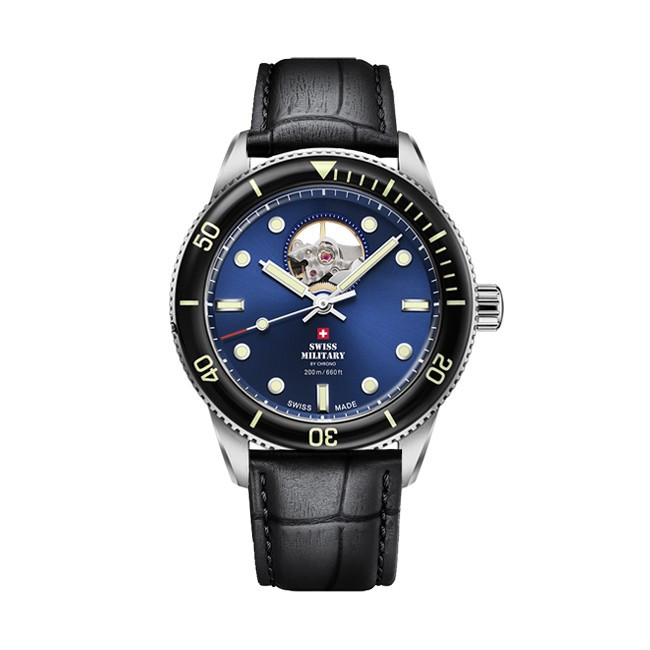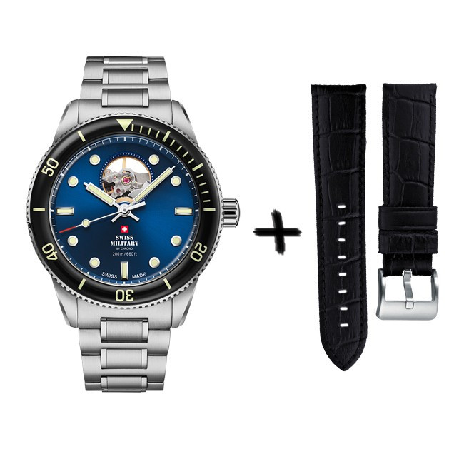 Часовник SWISS MILITARY by CHRONO SMA34106.12SET е луксозен мъжки швейцарски автоматичен модел от колекция SMA34106. Сетът включва часовник с open heart циферблат в наситено син цвят и допълнителна черна кожена каишка. Корпусът и верижката са изработени от благородна стомана, осигуряваща дълготрайност и елегантен блясък. Сапфир-кристал стъкло против надраскване и водоустойчивостта до 20 ATM подчертават швейцарската надеждност и съвременен стил.