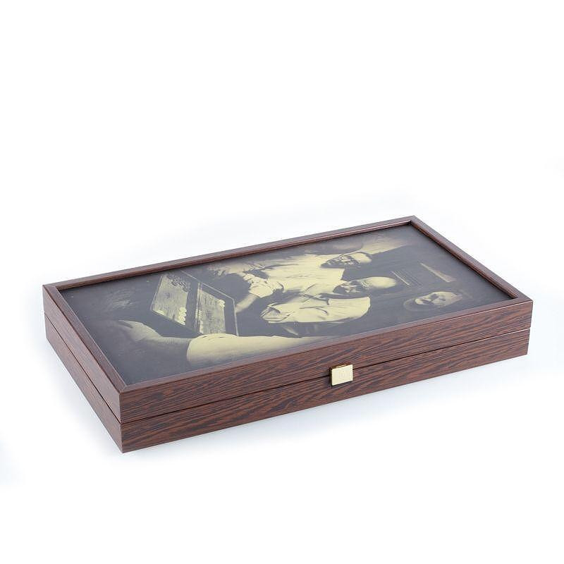 Дървена табла – махагон Размер – 38 х 19 см (затворена) Пластмасови пулове с размер - 26 мм 4x зарчета Произведено в Гърция