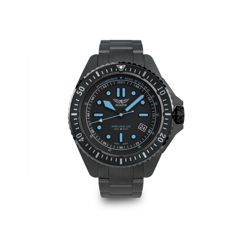 Часовник Aviator V.1.42.5.377.6 е мъжки кварцов модел с изцяло черна визия и сини индекси, съчетаващ модерен дизайн и професионална функционалност. Корпусът е изработен от неръждаема стомана с черно покритие, а черният матов циферблат е с апликирани сини индекси, изпълнени със SuperLuminova за отлична четимост. Механизмът е швейцарски Ronda 6003.D с 40 месеца резерв на батерията. Моделът е с водоустойчивост до 200 м, сапфирено стъкло и черна силиконова каишка с UV нано покритие – идеален за любителите на динамичен стил и надеждност.