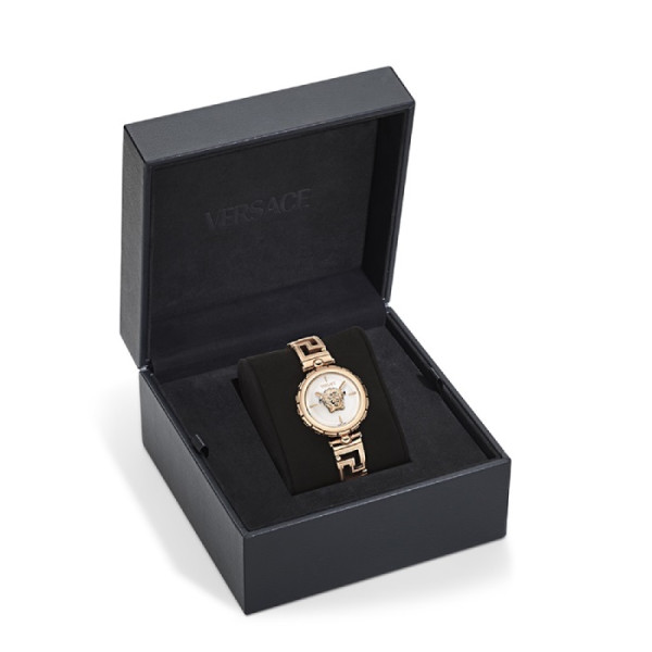 Часовникът Medusa Jewel възхвалява женствеността с триизмерно плаващо емблематично изображение на Медуза на циферблата, точно под логото на Versace на 12 часа. Елегантният дизайн е завършен с гривна с мотив Грека. Всички часовници на Versace са гарантирани с етикета "Swiss Made".Използваната неръждаема стомана е рециклирана – в духа на устойчивия лук