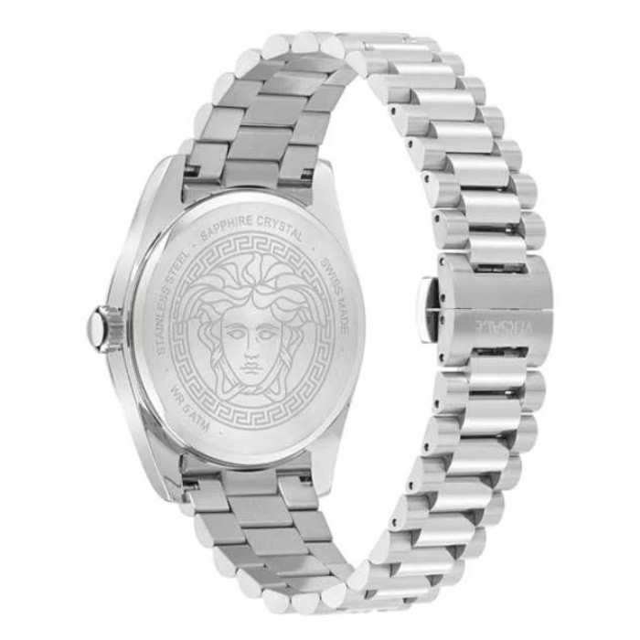 Часовник Versace VE0G00325 Millenyium впечатлява с баланса между класическа естетика и съвременен мъжки стил. Изработен от 316L благородна стомана, моделът разполага със син циферблат, който придава усещане за дълбочина и изтънченост. Стоманената верижка и пеперудната закопчалка осигуряват удобство и здравина при носене. Благодарение на швейцарския кварцов механизъм, сапфир кристала и водоустойчивостта до 5 ATM, този часовник е идеален избор за делови мъже, които ценят прецизността, надеждността и изискания външен вид.