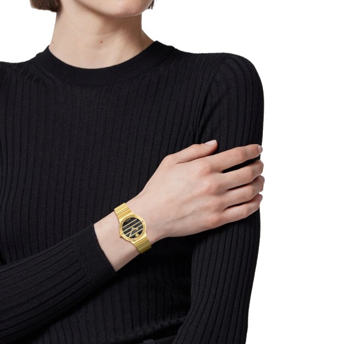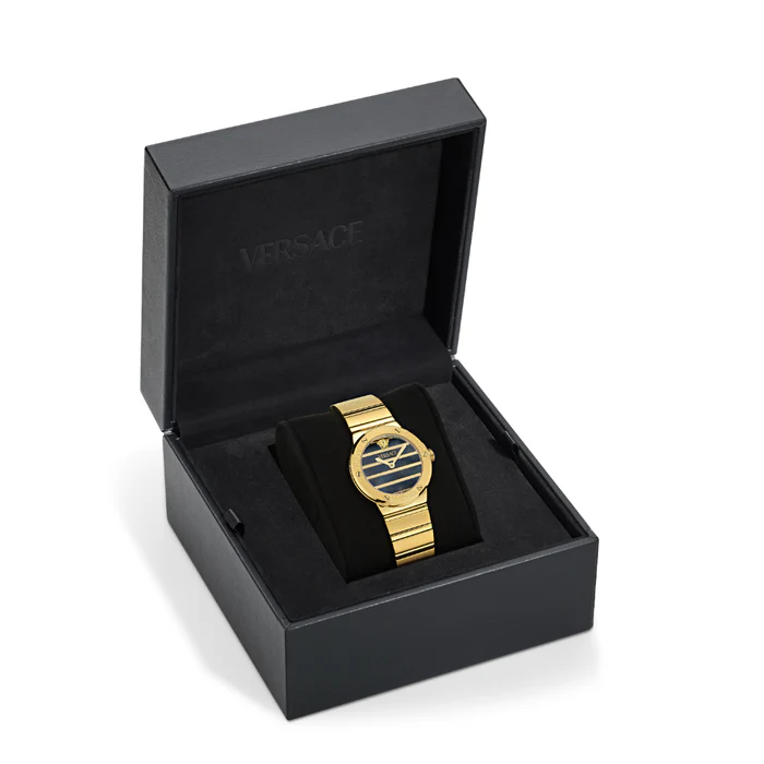 Часовник Versace VE0S00525 Greca Logo Pearl съчетава елегантност, финес и италиански лукс в съвършен баланс. Корпусът от благородна стомана с IP покритие в жълто злато и сапфир кристалът осигуряват издръжливост и изтънчен външен вид. Седефеният циферблат, без индекси, излъчва чистота и минимализъм, докато гравираният гръцки мотив (Greca) около безела придава отличителен характер на Versace. С швейцарски кварцов механизъм Ronda 762.2 и водоустойчивост до 3 ATM, този модел е перфектното допълнение към стила на всяка модерна дама.